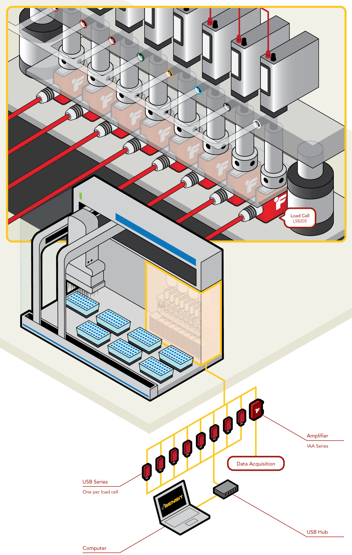 Each LSB200 can measure down to the microgram the fluid as it exits its dispensing tube. These microgram measurements require the use of SENSIT™ Test and Measurement Software alongside FUTEK's USB Solutions.