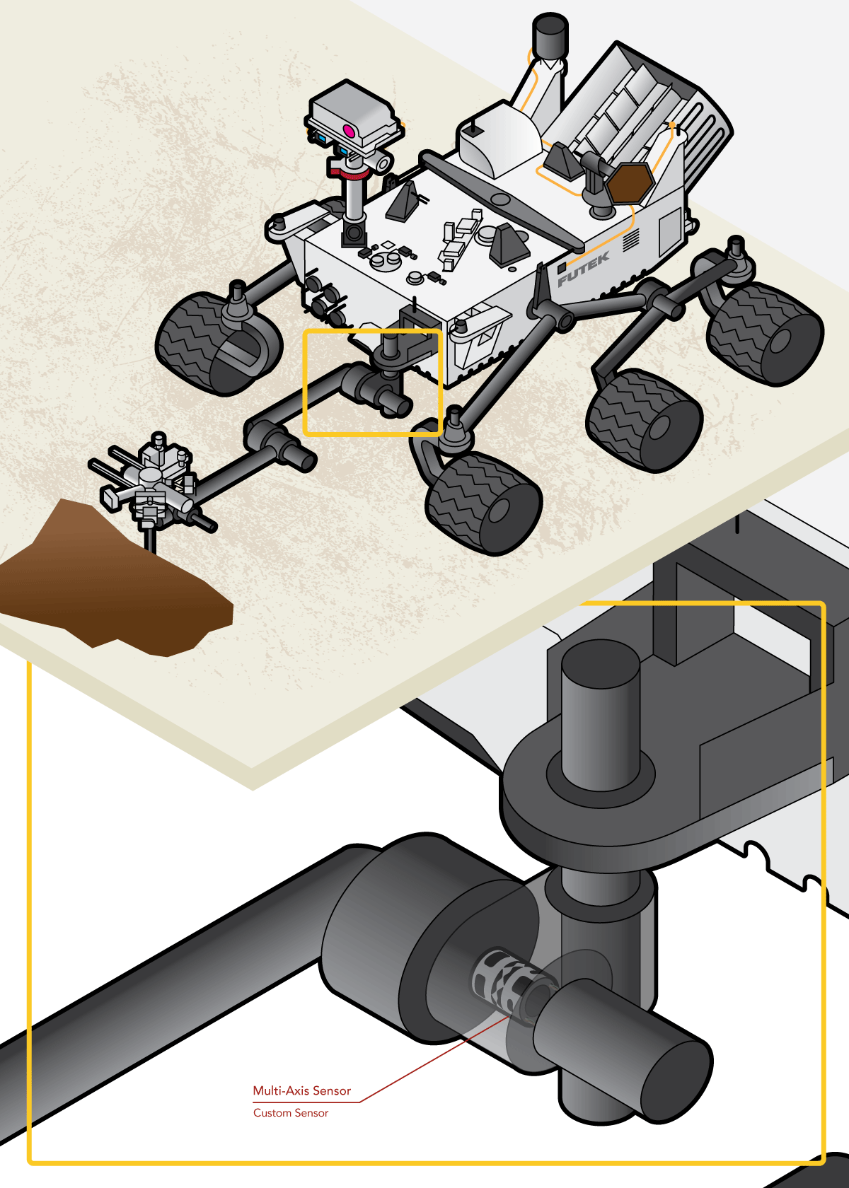 For the MSL Mars Rover Curiosity mission, FUTEK was commissioned by NASA JPL to develop a space/flight qualified cryogenic three component sensor. With capabilities of measuring torque and force, this sensor operates within the rover's robotic arm. As the arm maneuvers, the multi-axial sensor provides feedback to the operating device identifying the levels of torsion and force applied. The necessity of this multi-axial sensor is to alert the rover if over-exertion on the arm occurs.