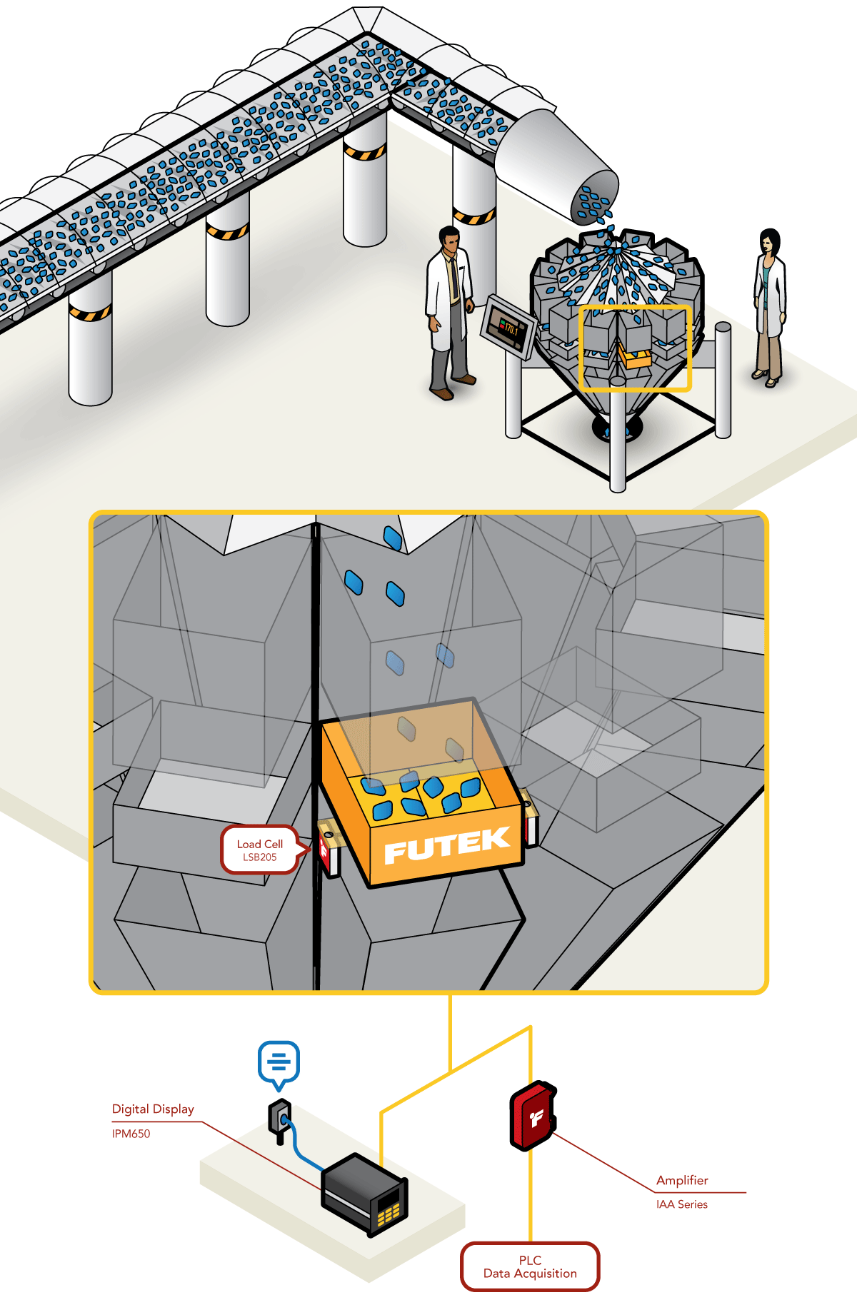 In this specific application, FUTEK has attached two LSB200 Jr. Miniature S-Beam Load Cells to each dispenser shaft. The LSB200, which is equipped with built-in overload protection, will measure the content’s load.