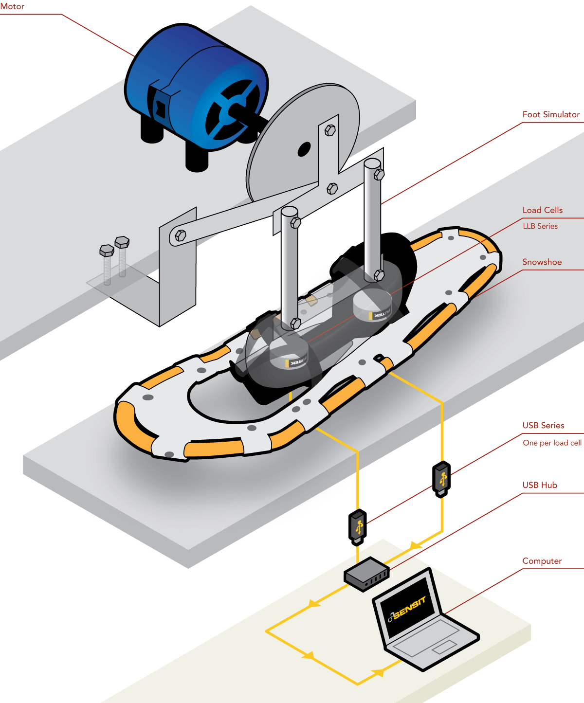 Each load cell is paired to a FUTEK USB Solution, allowing the operator to stream the data directly onto his/her PC.