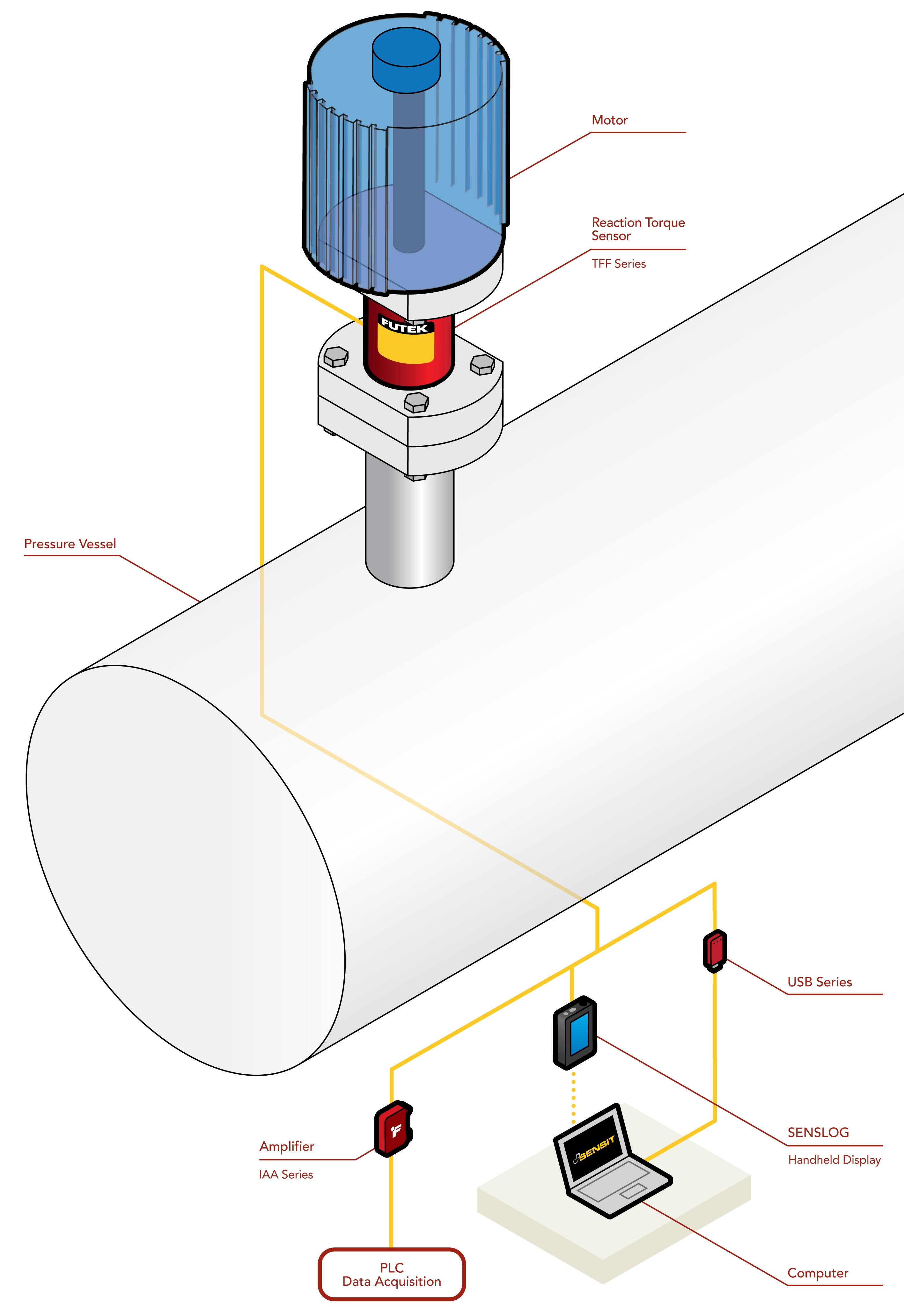 Reaction torque sensors are often used as auditing and monitoring tools. This application utilizes the TFF Series to measure the reaction torque required by an electric valve actuator/motor to operate a ball, plug, or butterfly valve.