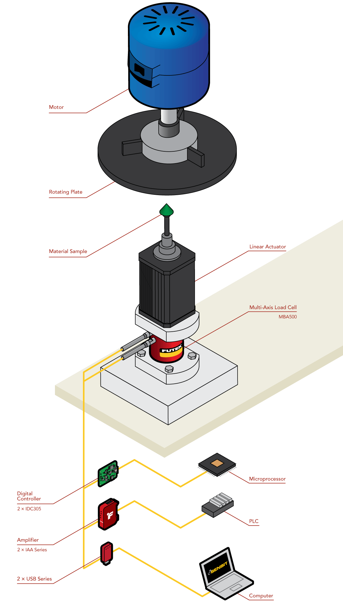 Brake pads and scratch resistant coatings require an understanding of their friction coefficient and useful life. This requires a tribometer to characterize these material properties. By incorporating a multi-axis load cell into the tribometer, high accuracy measurements of friction and material life can be achieved.