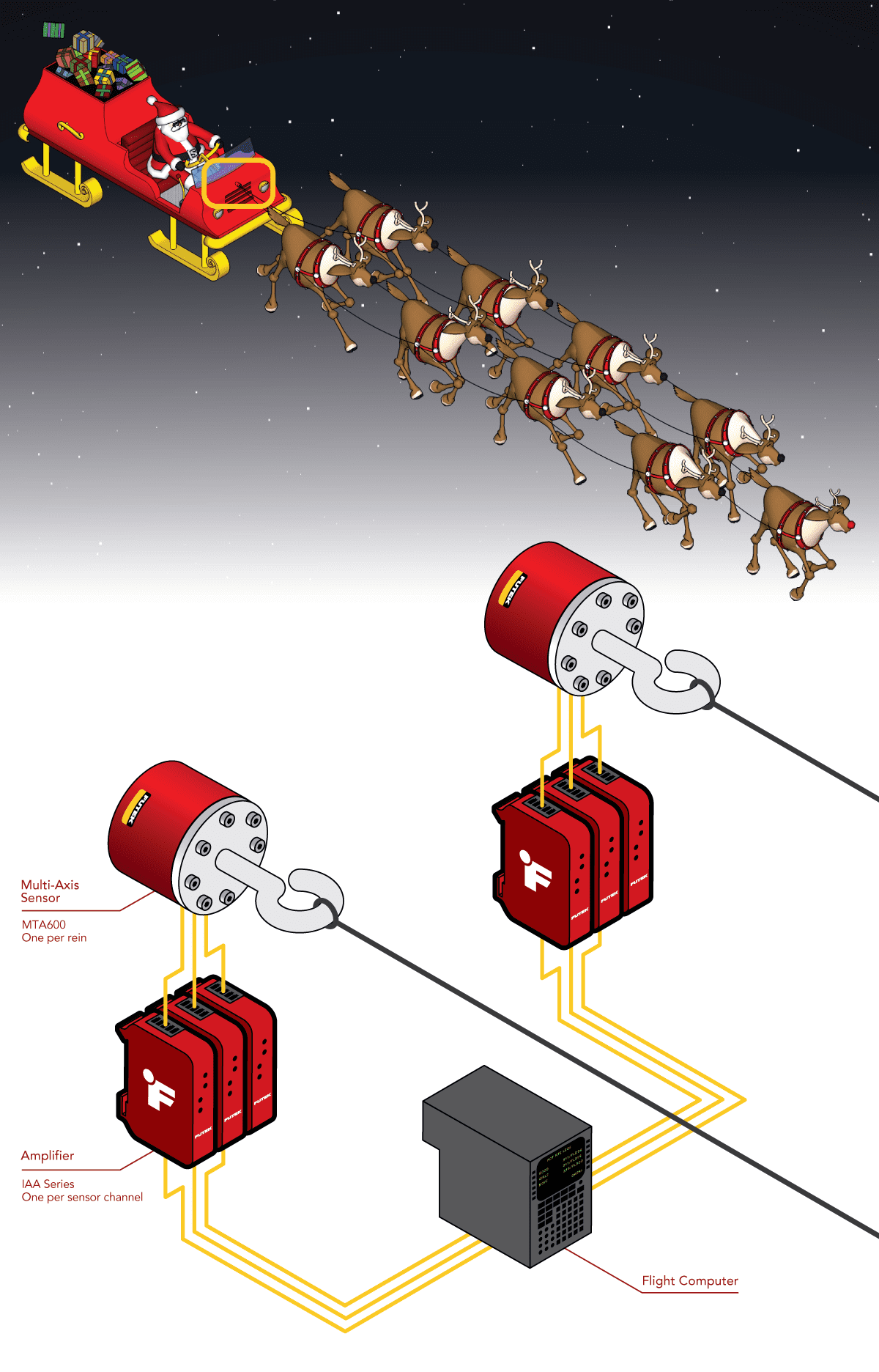 It’s December 24 and Santa Claus has a busy night delivering gifts to the 1.3 billion children in the world. To meet his delivery schedule, Santa relies on high precision GPS navigation and autopilot systems to minimize travel time. Load feedback is necessary to confirm rein inputs and monitor reindeer health (even magical flying reindeer can grow exhausted). To monitor the reindeer, their harnesses are tied to a pair of FUTEK tri-axial load cells.