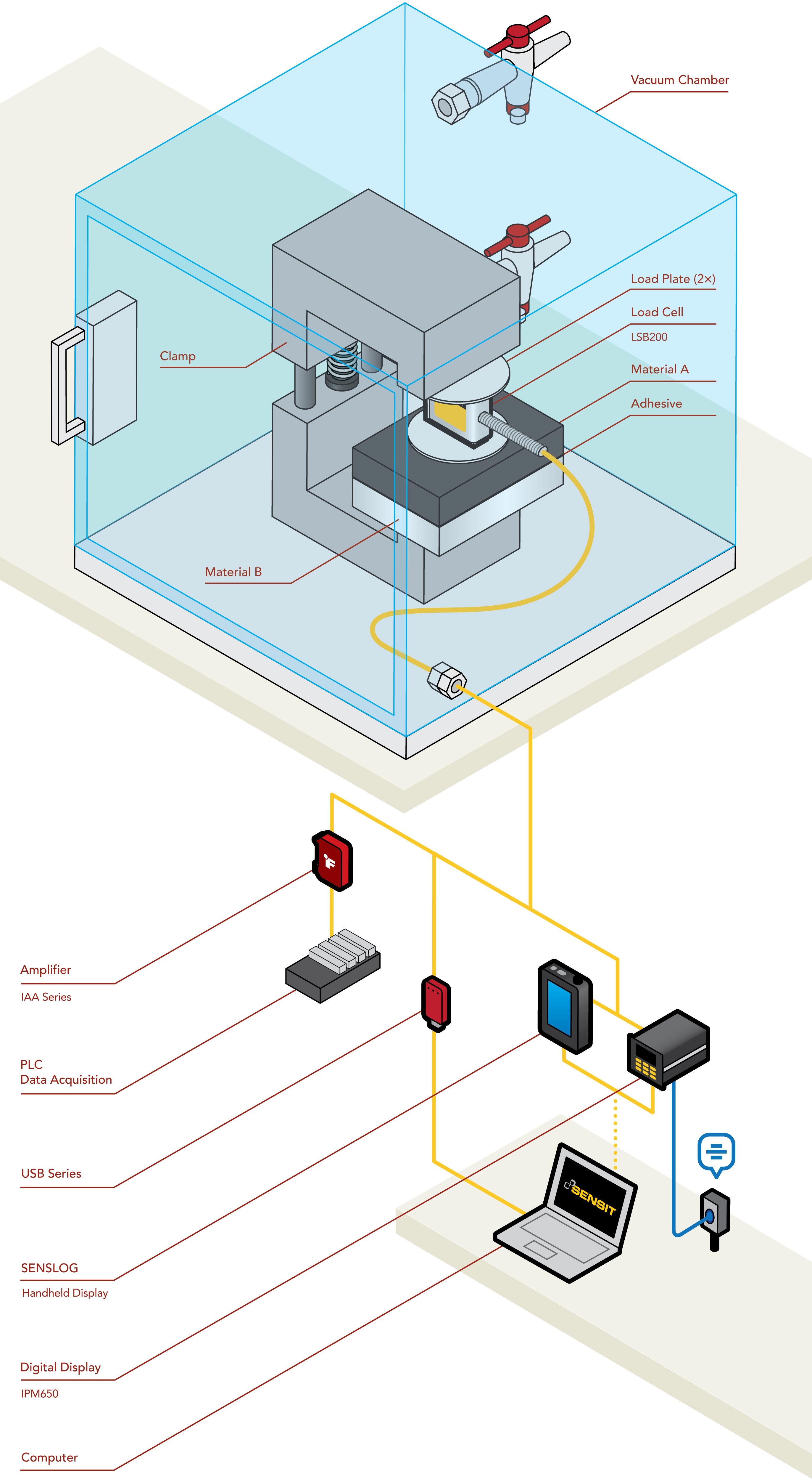 1. In this application, a Vacuum Compatible/Low Outgassing LSB201 Miniature S Beam Load Cell is installed in line with a clamp holding two materials to be bonded inside a vacuum chamber.
